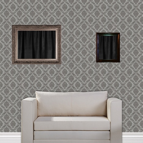 · Wallpapered wall with baseboard, loveseat and cut out picture frames so guests can